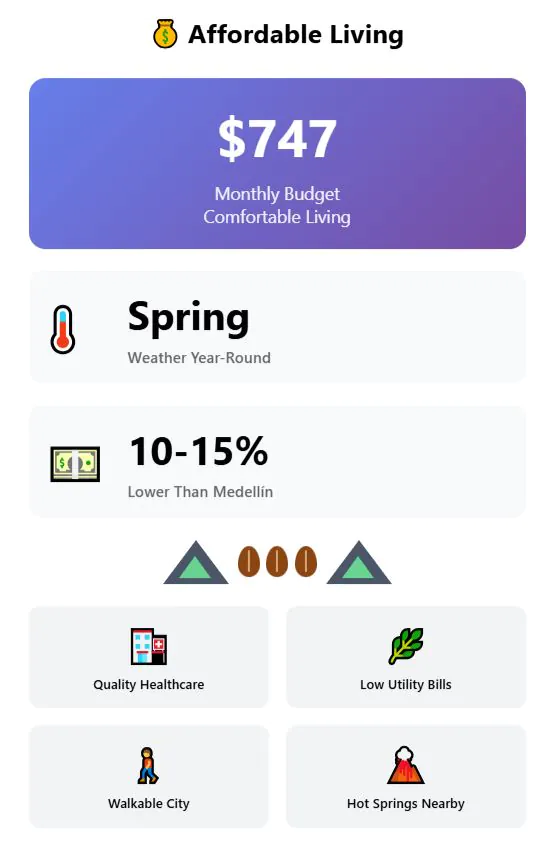 A single person lives very comfortably there for around $747 monthly, with the most frugal budgets managing on $600-700. Your monthly budget stretches incredibly far in the Coffee Triangle, running 10-15% lower than Medellín costs.