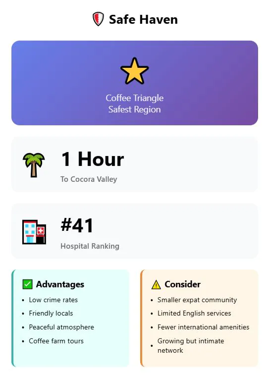 The Coffee Triangle region is generally considered one of Colombia’s safest areas, with low crime rates and friendly locals. This peaceful atmosphere creates a stress-free environment where you can walk safely and focus on work or relaxation.