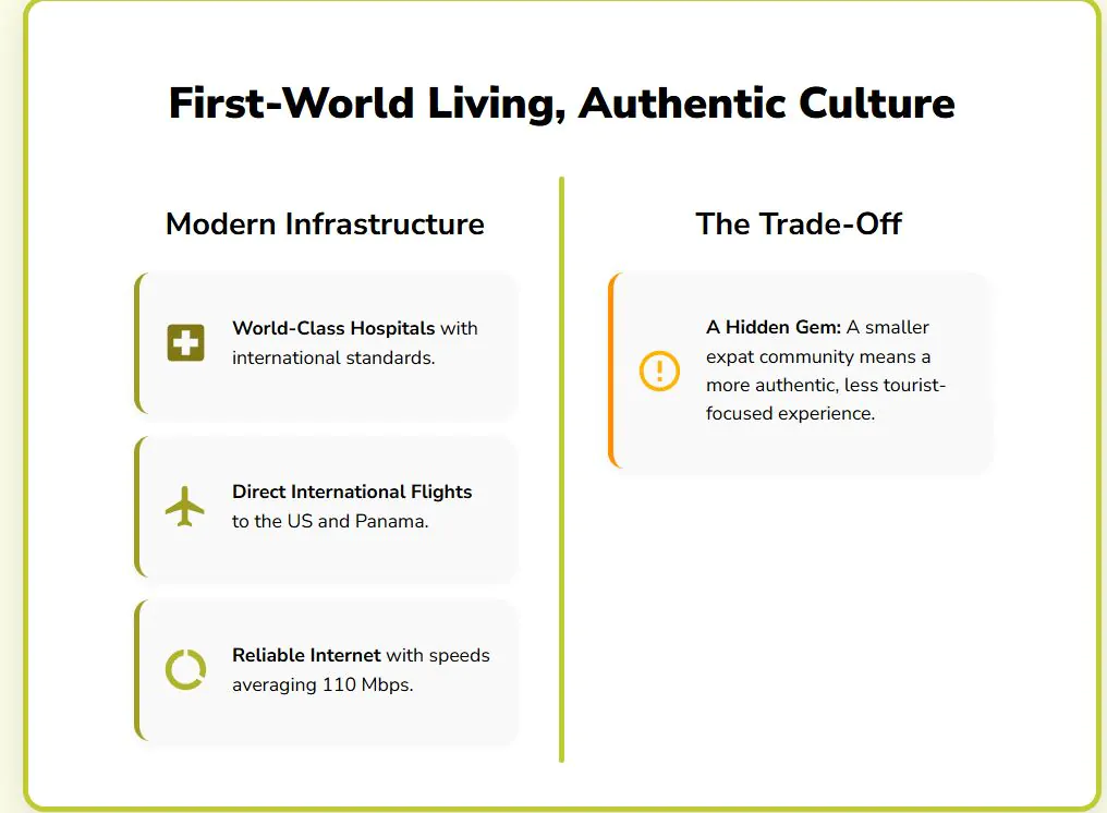 The pleasant year-round climate, with temperatures between 68°F and 82°F, keeps utility costs low. Palonegro International Airport offers direct flights to Fort Lauderdale, Miami, and Panama City, solving connectivity concerns while maintaining affordability.