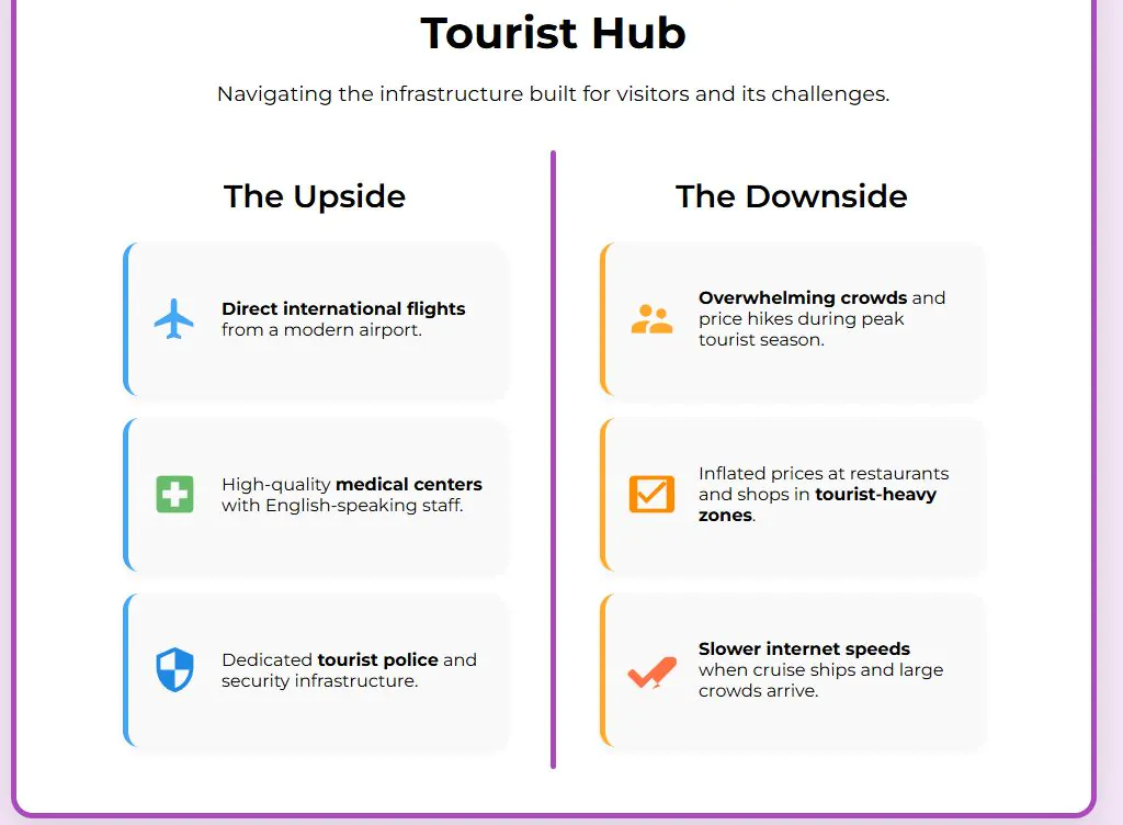 However, the focus on tourism creates distinct problems. During peak cruise season, crowds and prices spike—restaurants and transport get costlier and internet slows to around 8 Mbps. What feels charming in low season becomes overwhelming when tourist crowds arrive. Street vendors target anyone who looks foreign, and restaurants in tourist zones often charge double what locals pay.
