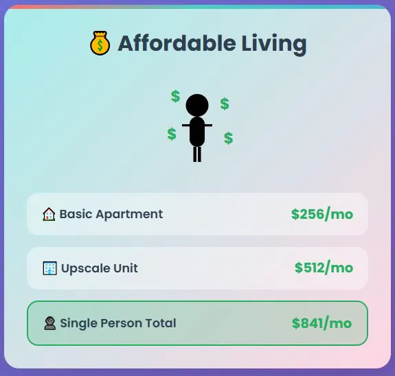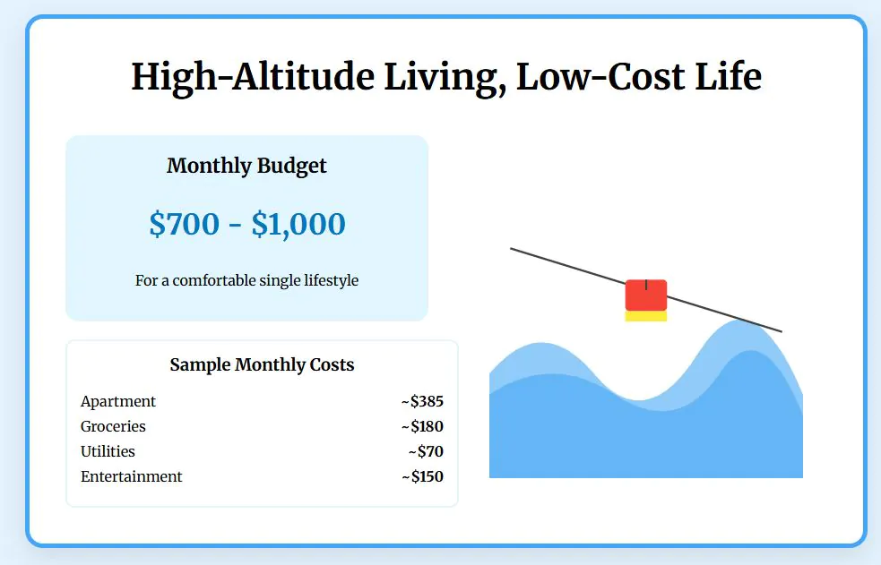 A single person lives very comfortably, with a total monthly budget potentially falling in the $600-700 range. Research shows a single person’s total monthly cost, excluding rent, can be as low as $310, with rent at $278, illustrating the true bottom-line affordability. Dining out costs practically nothing – a meal at an inexpensive restaurant averages just $3.61.
