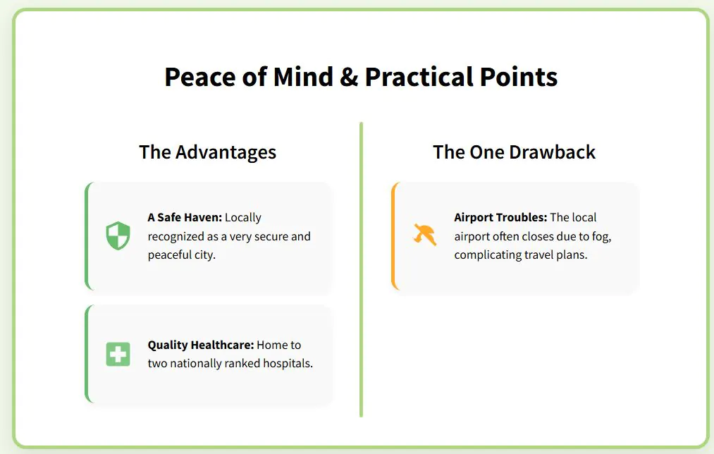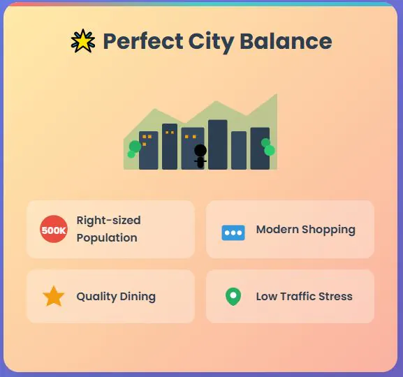 The city balances small-town affordability with big-city convenience. Its population of 500,000 is large enough for shopping centers, diverse restaurants, and urban amenities, yet small enough to avoid major traffic and stress.