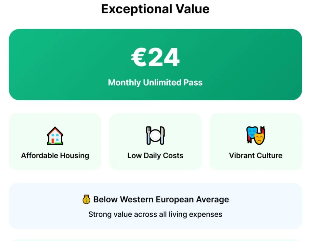 This mobility package is then combined with costs well below the Western European average. A monthly pass costs 9,500 Hungarian Forint, or about 24 euros, granting unlimited access to this vast network. When you pair this with affordable housing and daily expenses, Budapest presents a strong value.