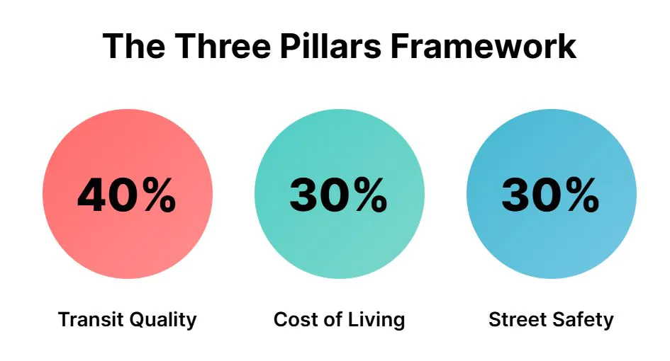 I used a weighted model with three pillars: Public Transport Quality at 40%, Affordability at 30%, and Safety at 30%. This keeps the focus on places where you can live well without a car.