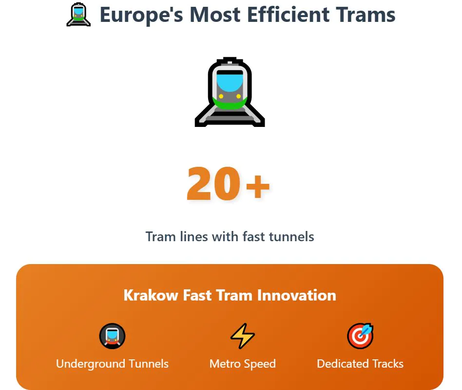 Kraków is also a very safe city – for many, even safer than Warsaw (unless there is a football derby happening). This sense of personal safety supports walkability at all hours. Kraków’s mobility pillar is built on a single, powerful system: its trams. Instead of a metro, the city has invested in creating one of the most efficient tram networks in Europe.