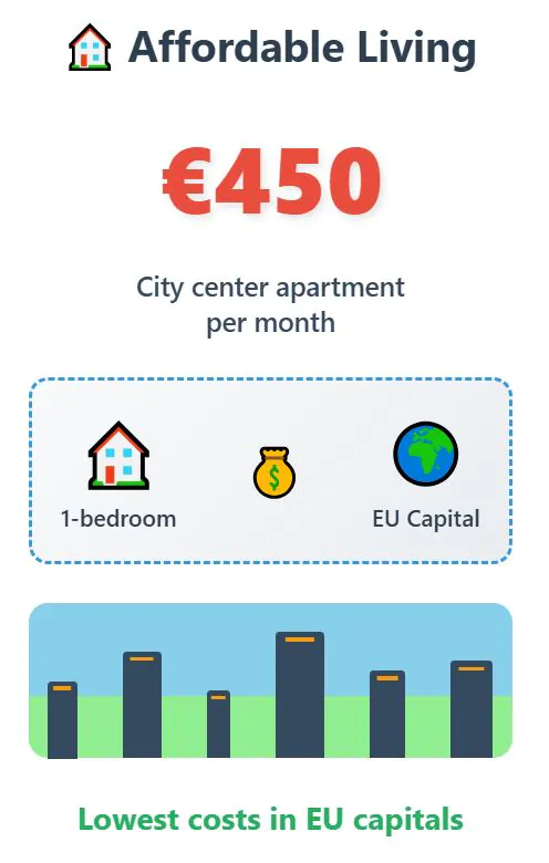 The cost of living is one of the lowest in any capital in the European Union. A one-bedroom apartment in the city center can be rented for as little as 450 per month, a figure that is unthinkable in Western Europe. The low costs mean your money goes significantly further, freeing up resources that would otherwise be spent on car payments, insurance, and fuel.