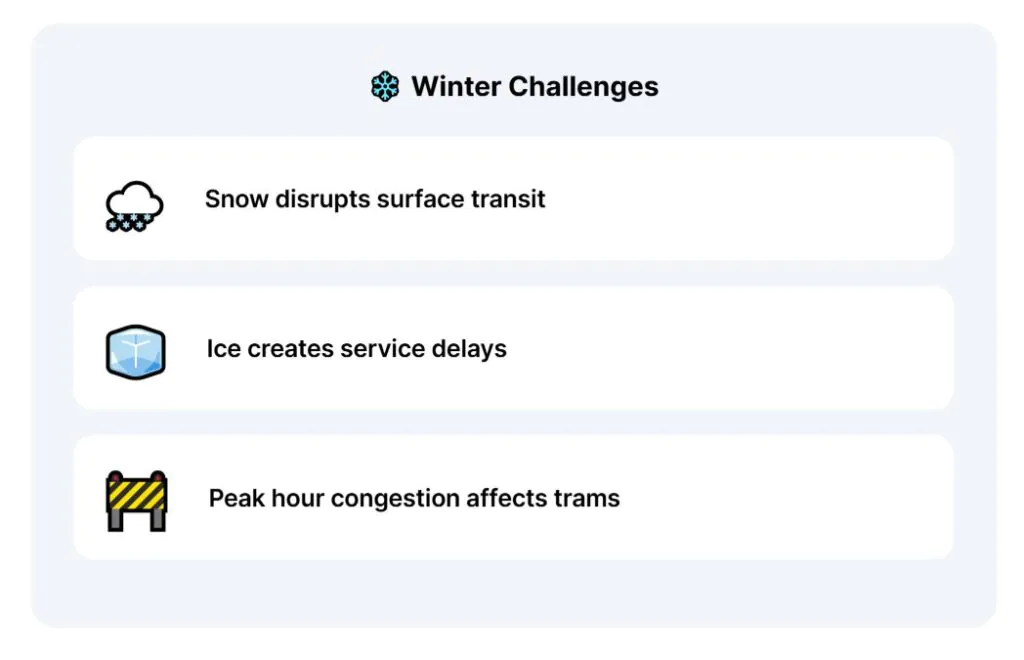 While the city operates a well-maintained and effective network of buses and modern trams providing good coverage, it lacks a high-capacity, grade-separated metro system. This is a critical factor for all-weather reliability. Surface-level public transport is exposed to the same conditions that affect car drivers. During peak traffic hours, trams and buses can face delays. More importantly, in a city known for its harsh winters, snow and ice can significantly disrupt service, creating unpredictability that an underground system would entirely avoid.