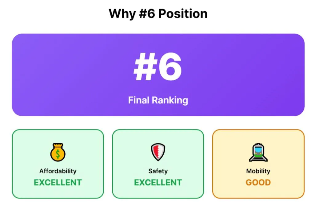 This is the city that balances all three pillars of our analysis: mobility, affordability, and safety.