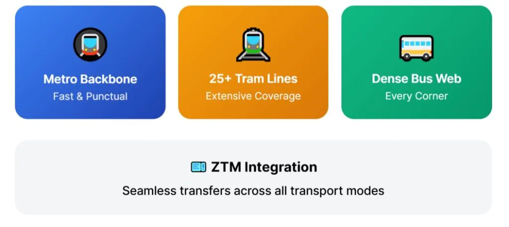 This underground network is then supplemented by one of Europe’s most extensive tram systems, with over 25 lines crisscrossing the city, along with a dense web of buses that reach almost every corner. This multi-layered system is fully integrated under a single ticketing authority, the ZTM, making transfers between the metro, trams, and buses seamless.
