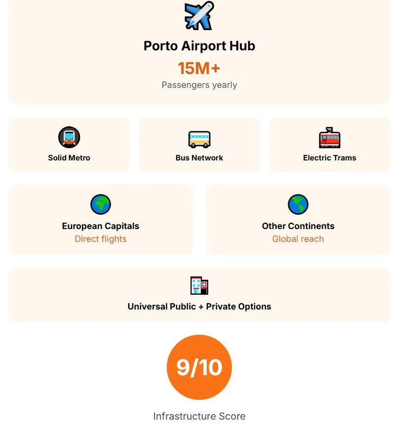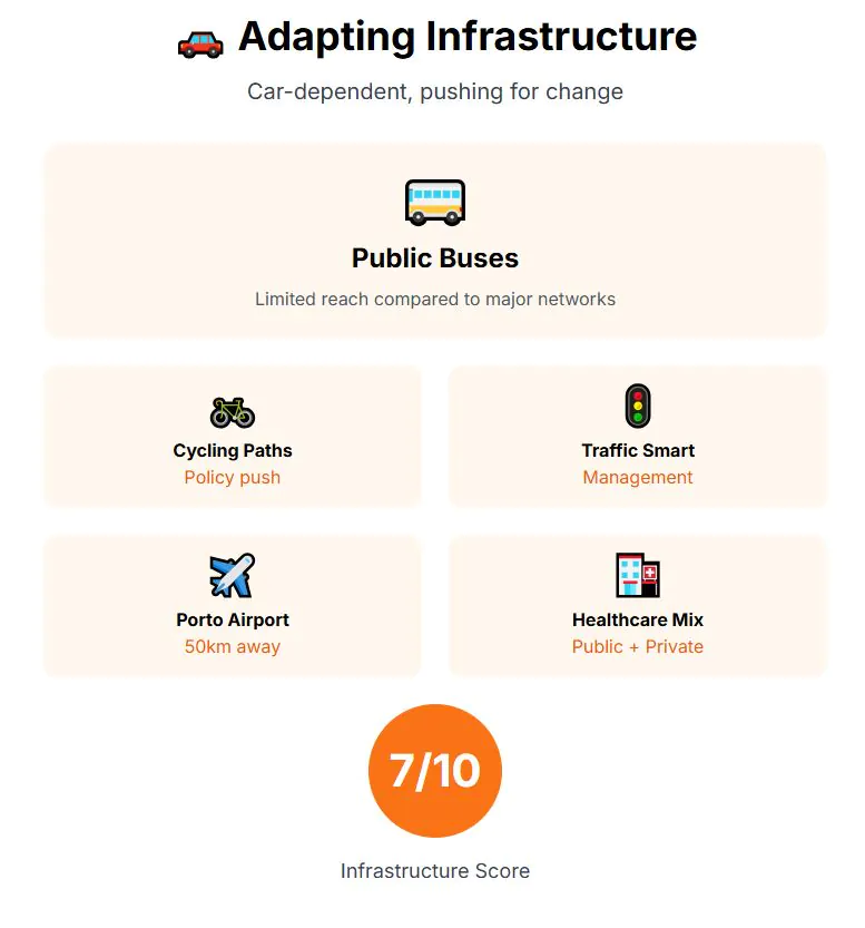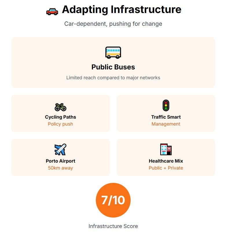 Infrastructure is still adapting. Most trips are made by car, but policies are pushing for cycling paths and smarter traffic management. Public buses serve the city but lack the reach of larger networks. By air, Porto’s international airport – just 50 kilometers away – provides full connectivity to European capitals. Healthcare combines Portugal’s universal public system with optional private insurance for faster service. Infrastructure score: 7 out of 10.