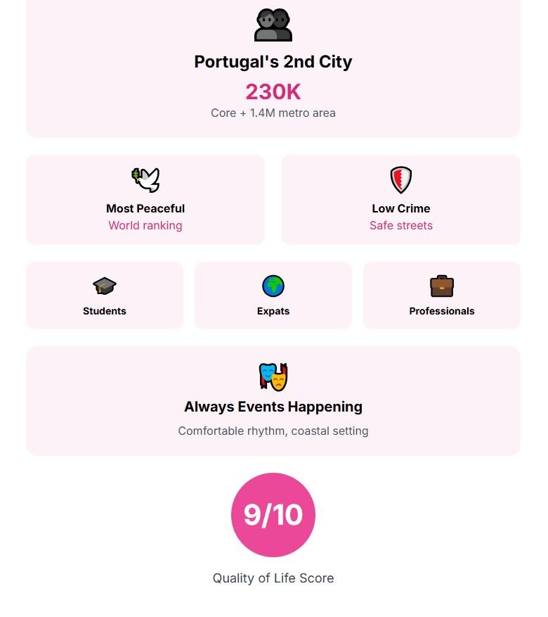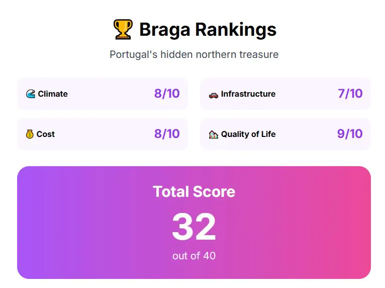 Braga, a city in northern Portugal with around 200,000 residents, often gets overshadowed by Lisbon or Porto, but it holds its ground with lower costs and a manageable climate.