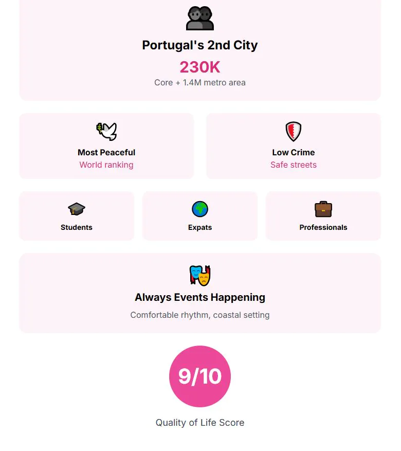Quality of life completes the picture. Portugal consistently ranks among the most peaceful countries in the world, and crime rates in Porto are low. Porto has a huge population of students, expats, and young professionals, so there are always events happening. Combined with the coastal setting, the city’s rhythm remains comfortable without overwhelming scale. Quality of life in Porto scores 9 out of 10.