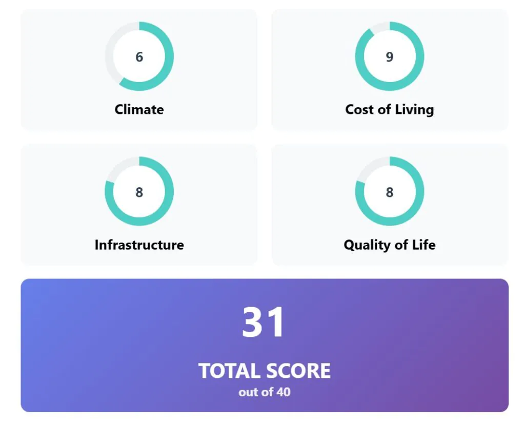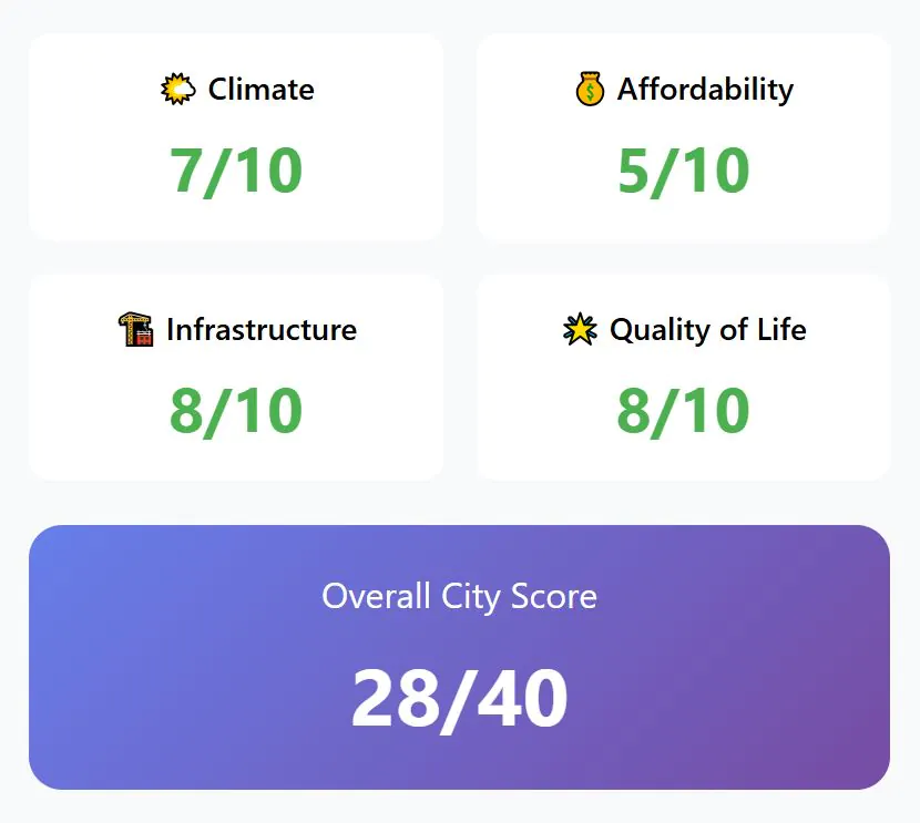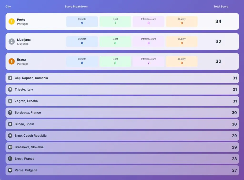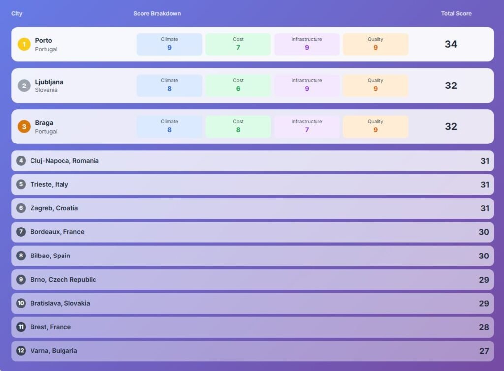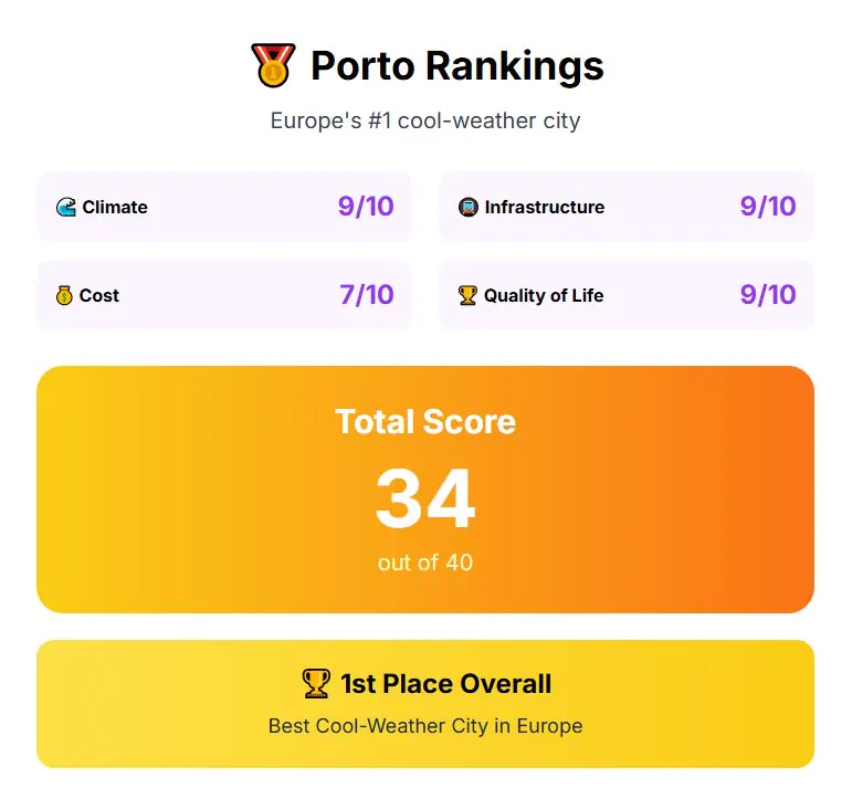 Adding all factors together, Porto totals 34 points. It combines a mild Atlantic climate, fair costs, a safe community, and reliable services, making it the top cool-weather city to live in Europe.
