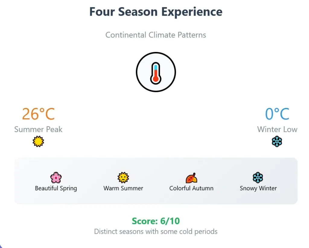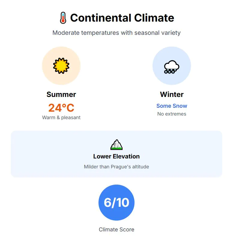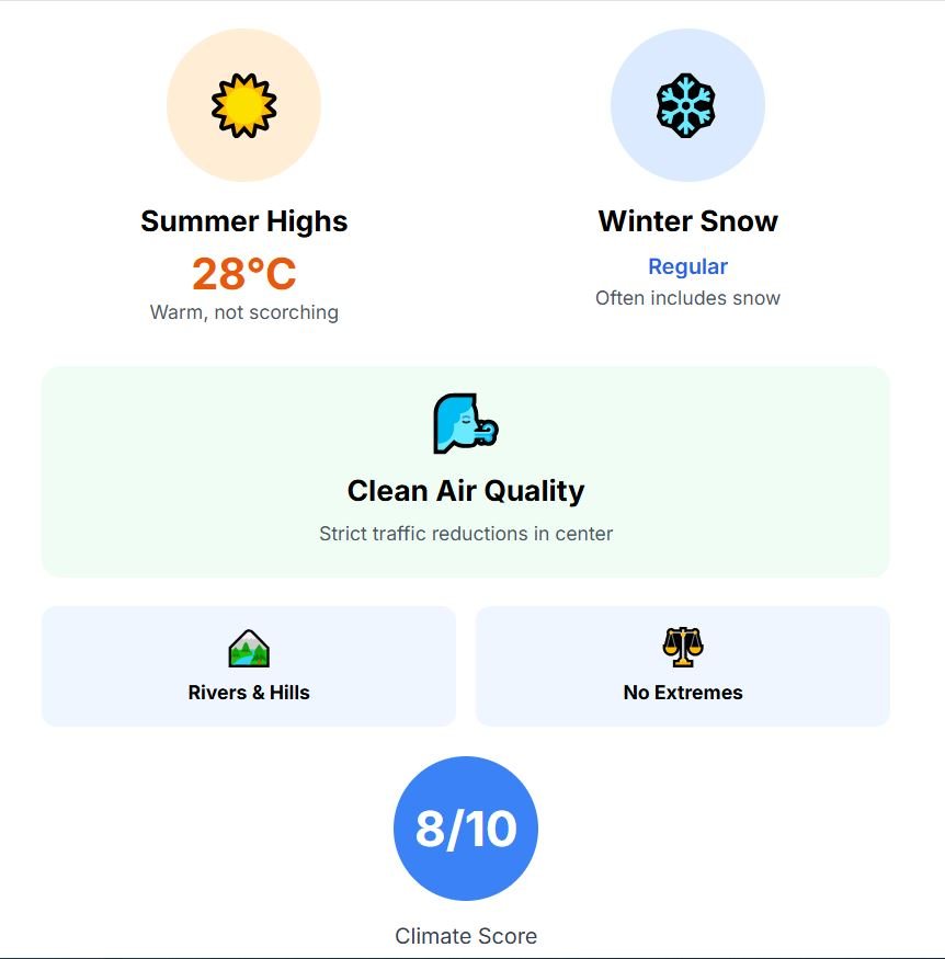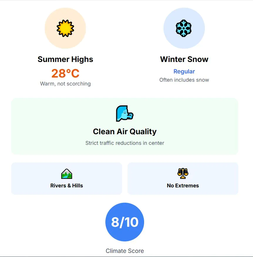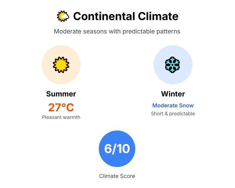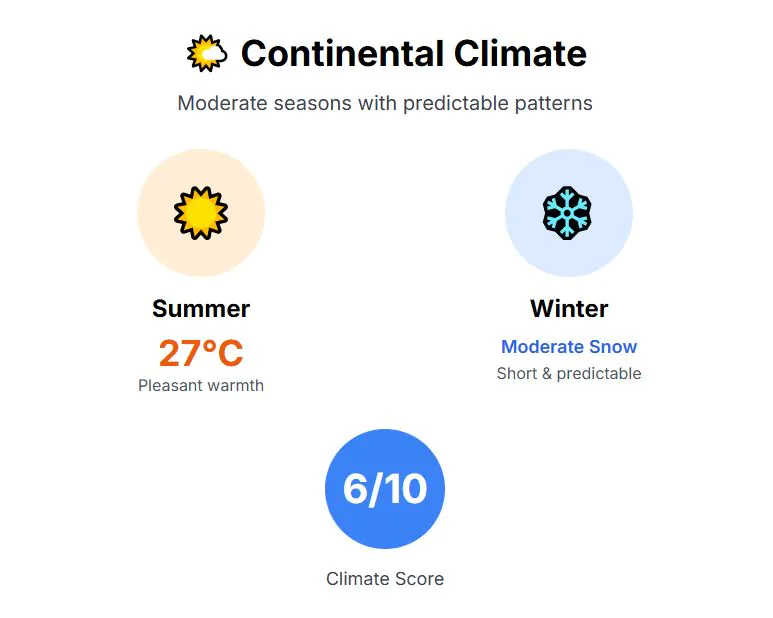 The climate is continental, so summers are warm and pleasant, with highs near 26°C, while winters have some freezing days below zero and a bit of snow. It offers clear seasons, a beautiful spring and autumn, but some cold days. Climate score: 6 out of 10.