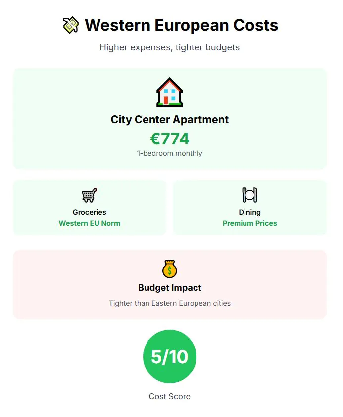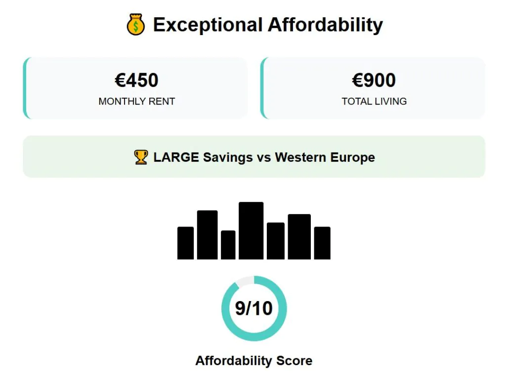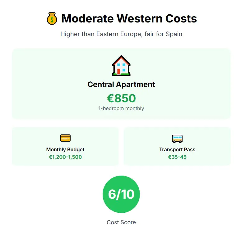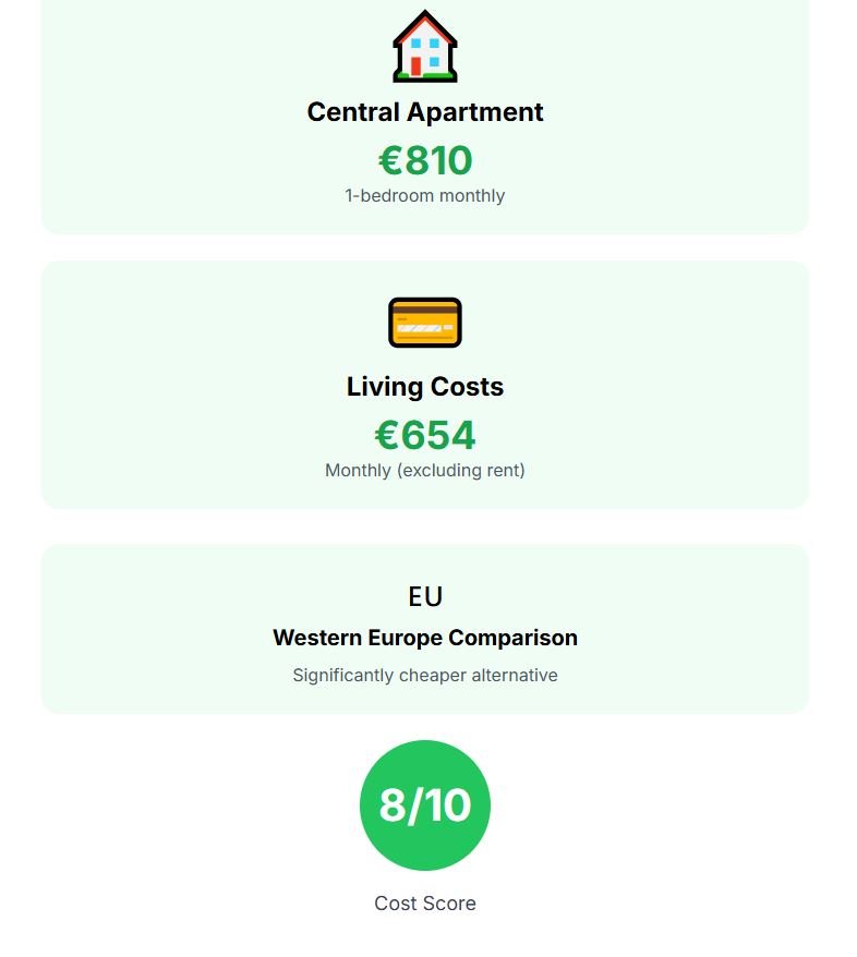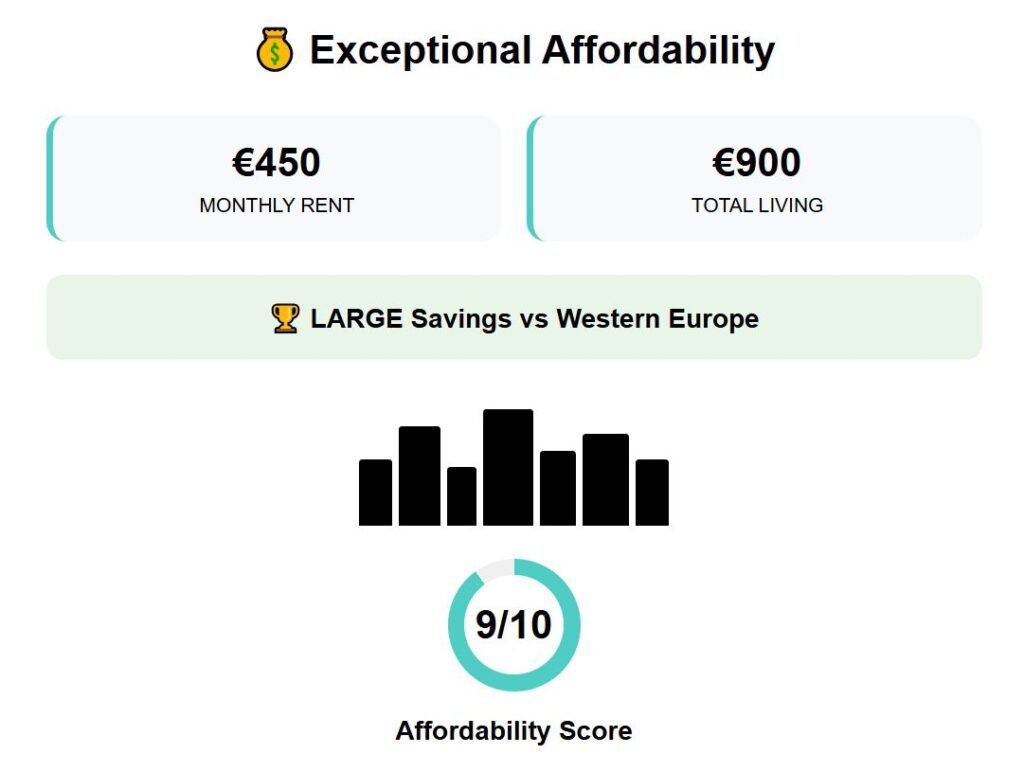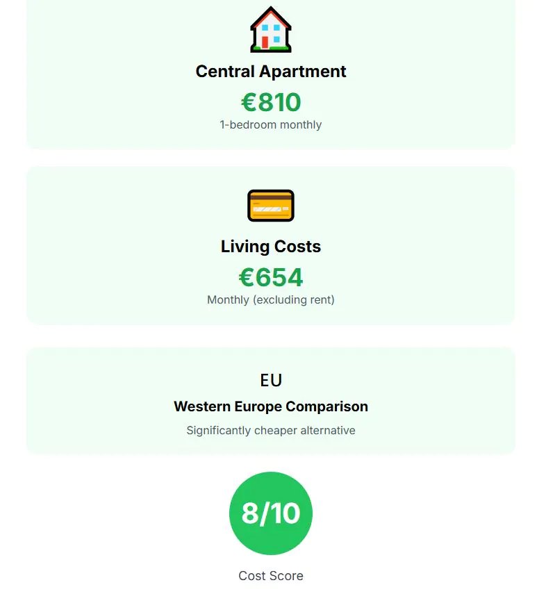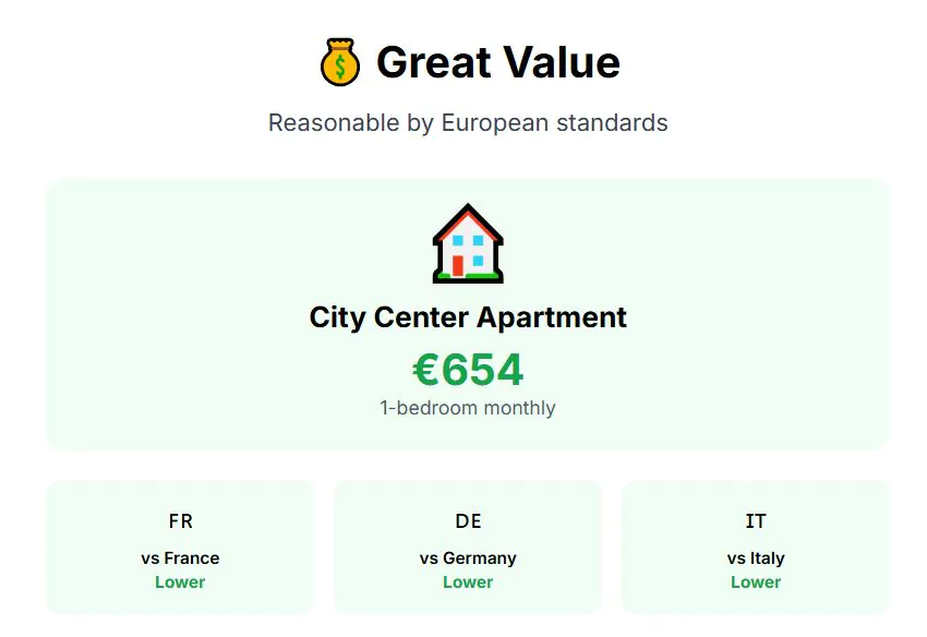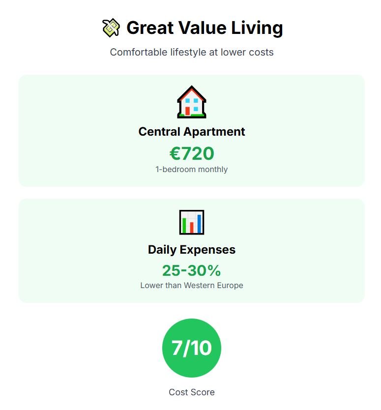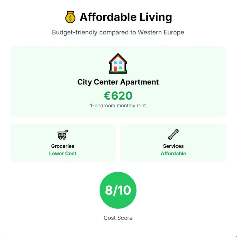 Costs remain reasonable by European standards. A one-bedroom apartment in the center rents for about €654 monthly, with overall living costs comfortably lower than cities in France, Germany, or Italy. Cost of living score: 8 out of 10.