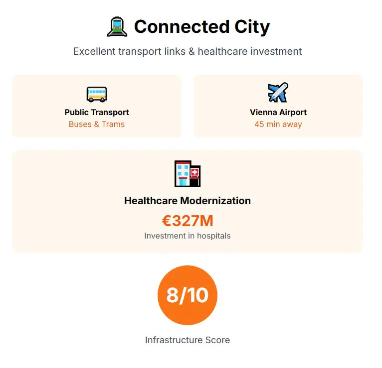 Infrastructure has mixed results. Public buses and trams connect the compact city easily, and Vienna’s international airport is only 45 minutes away by highway or train, giving access to the wider European network. Bratislava’s own airport offers low-cost flights across the continent. Healthcare is under reform, with €327 million invested to modernize major hospitals and improve care standards. Still, Bratislava is so close to Vienna, that if any need arises, you can just take a quick train. For such a privileged location, the infrastructure score is an 8 out of 10.