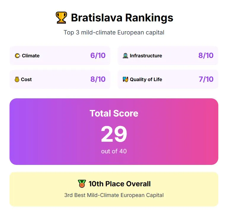 Combined, Brest records a total score of 28. Heading inland, the next stop is Slovakia’s capital, where affordability balances better with city living.