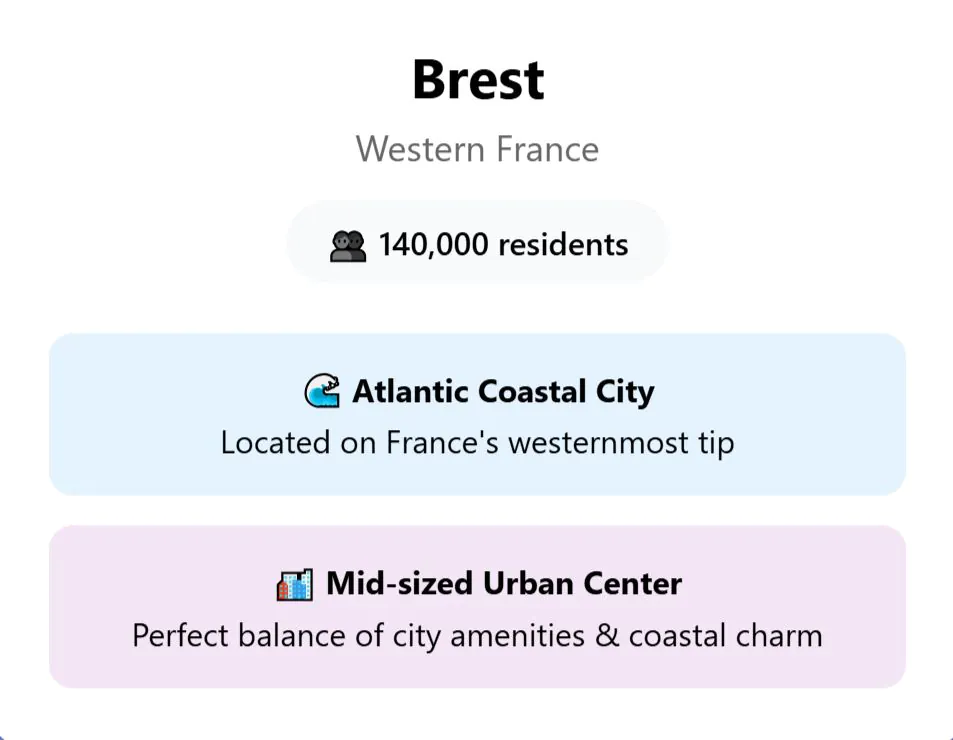 On the far western tip of France, Brest sits on the Atlantic coast with a population of about 140,000. The city’s climate is oceanic, meaning summers remain cool and winters are wet, but it rarely experiences days below freezing. Even in August, average highs stay around 22–26°C, keeping conditions moderate through the year.