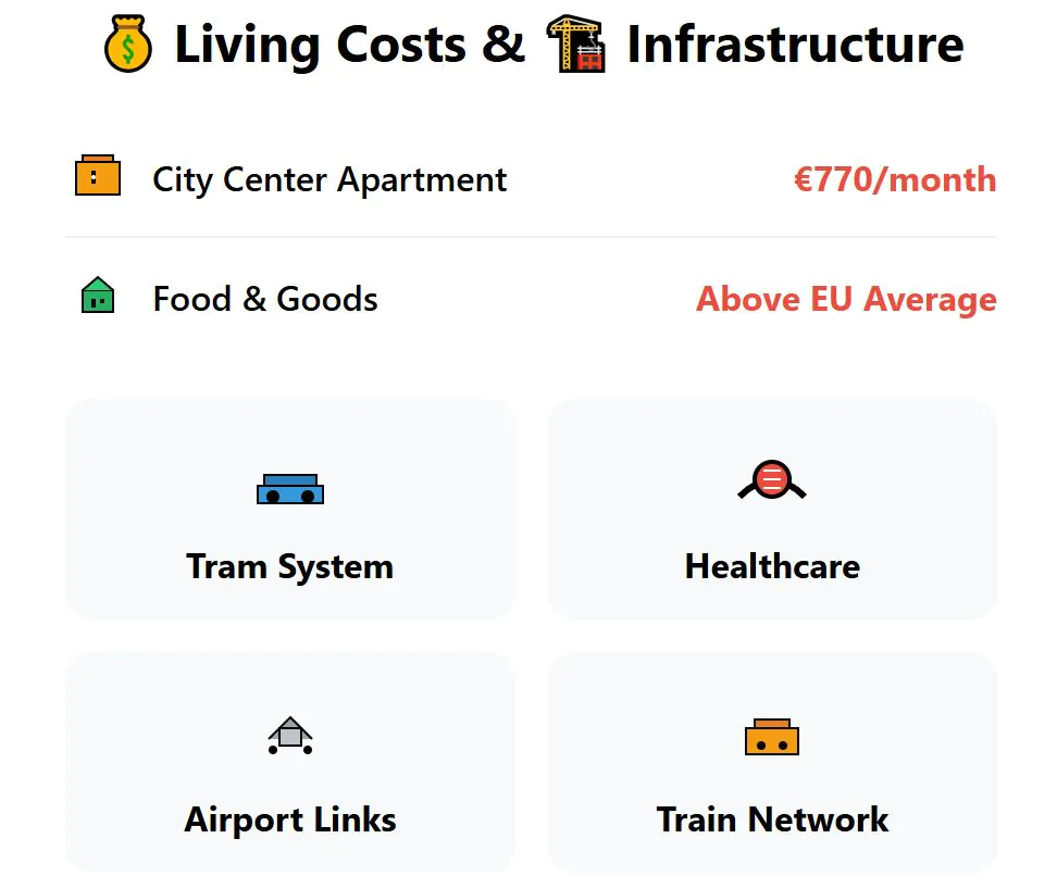 The cost profile is one of Bratislava’s advantages. A one-bedroom apartment in the city center rents for about €620. Groceries and daily services are lower than in Western European cities, which helps stretch your budget further. Cost score: 8 out of 10. ,