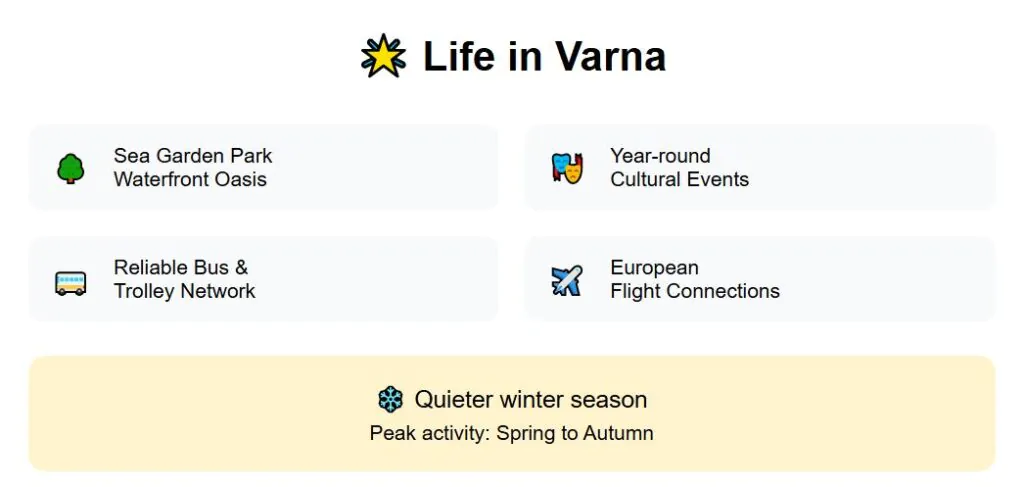 Quality of life has its ups and downs. On the plus side, the Sea Garden park stretches for kilometers right along the waterfront, providing a daily oasis few cities can match. Cultural events run year-round, and crime levels stay relatively low.