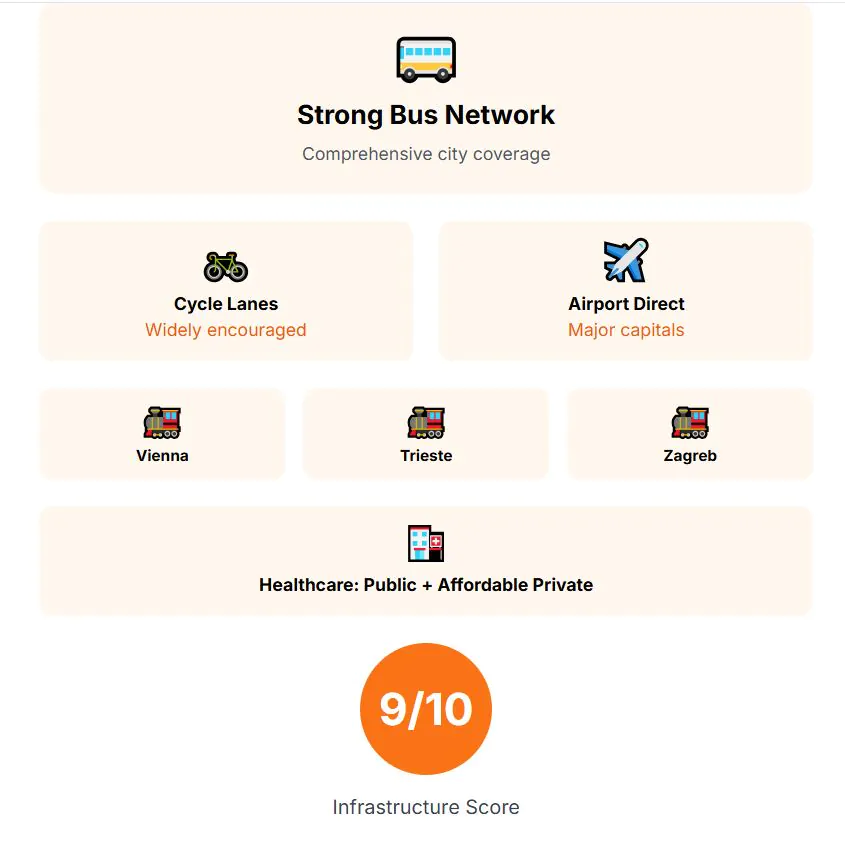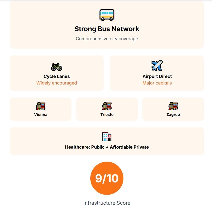 Infrastructure is mixed. Zagreb relies heavily on its tram-and-bus network, which forms the city’s backbone. Efforts are underway to electrify fleets, and smart cycling initiatives are being introduced, paving the way for greener transport. The airport connects to other European capitals with direct routes. Healthcare coverage is universal, but the main drawback is long waiting times in the public system. Good private healthcare options are available – Infrastructure score: 8 out of 10.