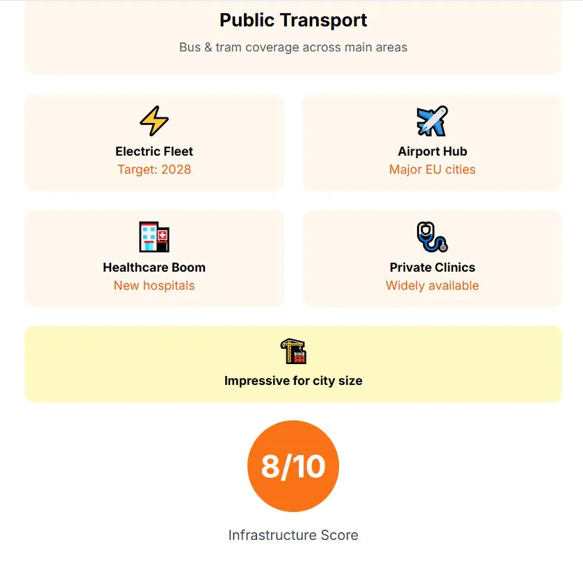 The infrastructure is decent for a mid-sized city. The bus and trolley network connects the residential areas reliably to downtown. The airport also has flights to other European capitals, but the schedule is seasonal and many routes are cancelled during the low season. In terms of hospitals and healthcare, there are some decent private institutions with affordable prices. Infrastructure score: 6.0.