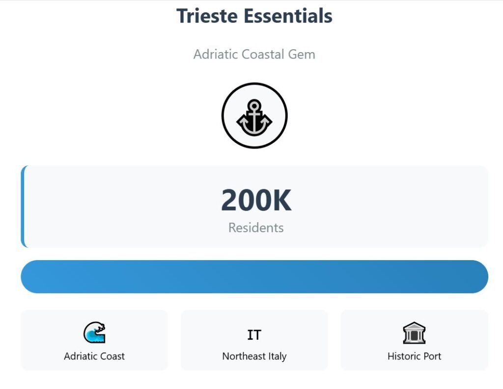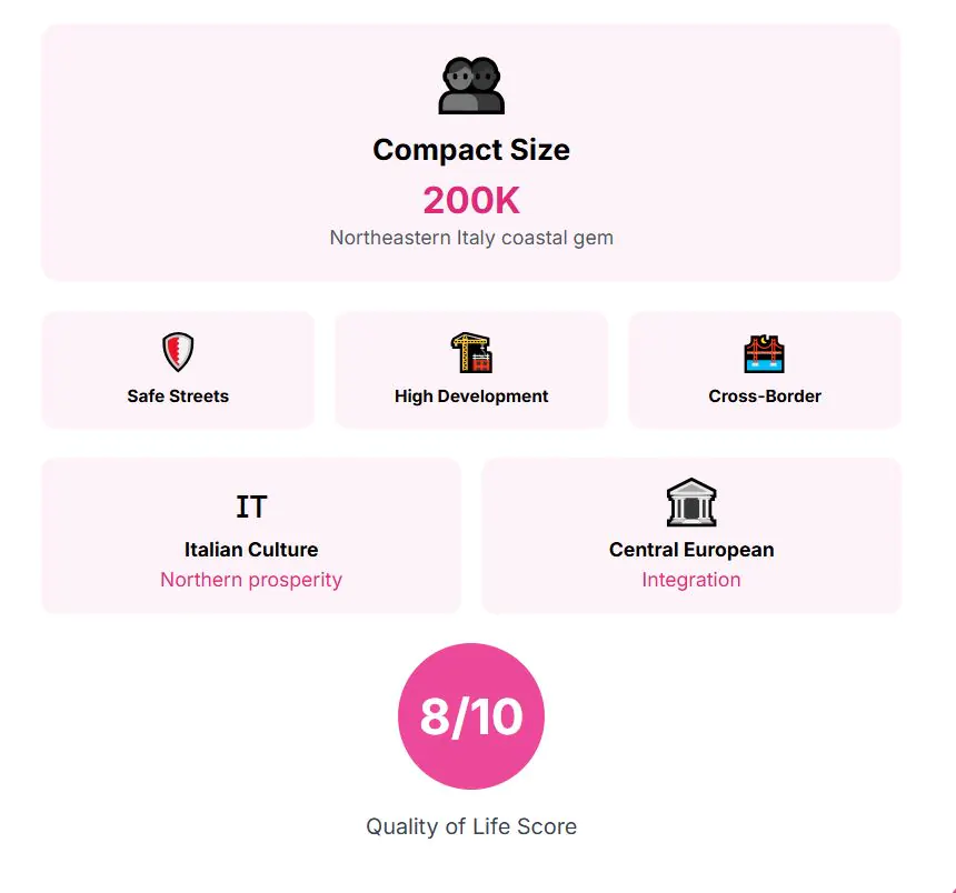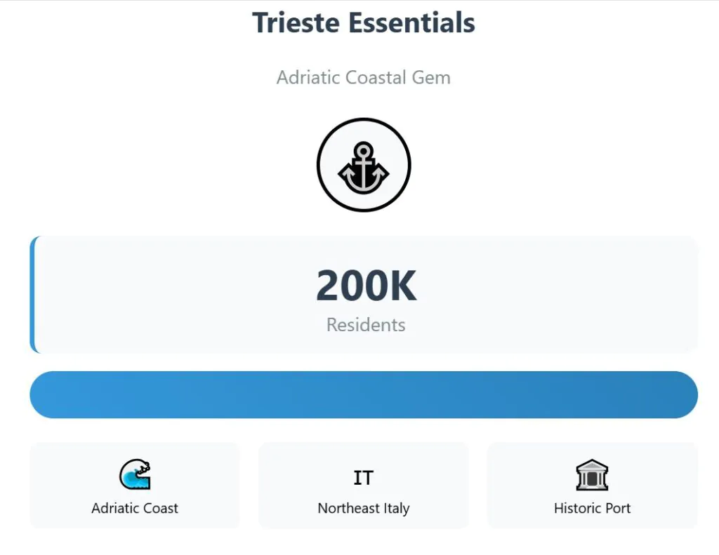 Trieste is in northeastern Italy, right on the Adriatic Sea, with a population of about 200,000 people. Its coastal position gives it warmer, but not too hot, summers, with highs around 28°C, and colder winters compared to Italy’s interior cities.