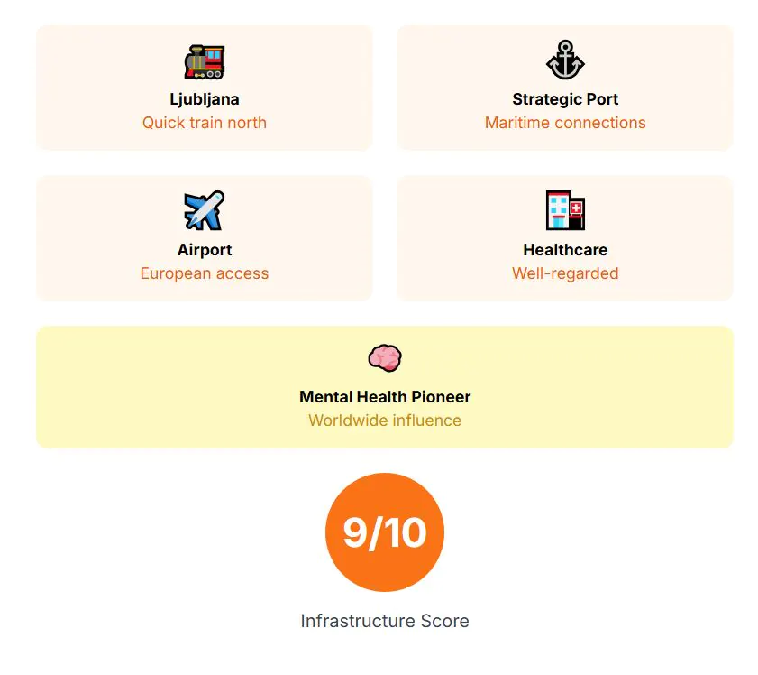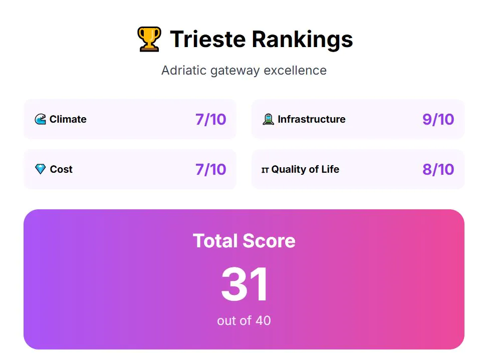 Infrastructure is even better. A tram and bus network serves the city, and the proximity to Ljubljana allows quick train travel north for cross-border commuting. Trieste’s port also provides strategic connections, while the airport ensures access to wider Europe, though with fewer routes than major hubs. Healthcare services here are well-regarded, and notably, the city pioneered a mental health system that remains influential worldwide. Infrastructure score: 9 out of 10.