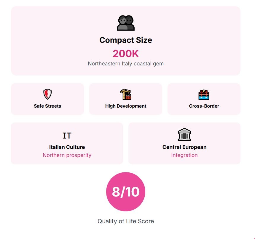 Quality of life benefits from safe streets, the high level of development of northern Italy, and integration between Italian and Central European cities. Quality of life score: 8 out of 10.