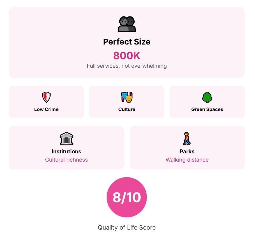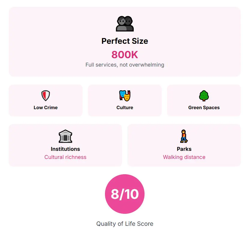 Quality of life is high across multiple fronts. Safety is consistent, with very low crime rates, parks and green areas are easy to access, and community events keep residents engaged. The city is sometimes compared to a smaller, Central European version of Copenhagen for how livable it feels on a daily basis. Quality of life score: 9 out of 10.