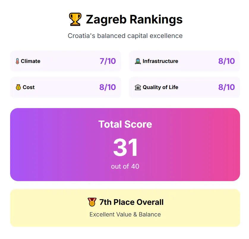 Summers are warm, sometimes reaching 30°C in July, but not scorching like in Sicily, while winters are snowy but not overly severe, averaging just below freezing for a short time. So the key here is that sometimes Zagreb might be hot or cold, but not for long. For climate balance, Zagreb earns a score of 7 out of 10.