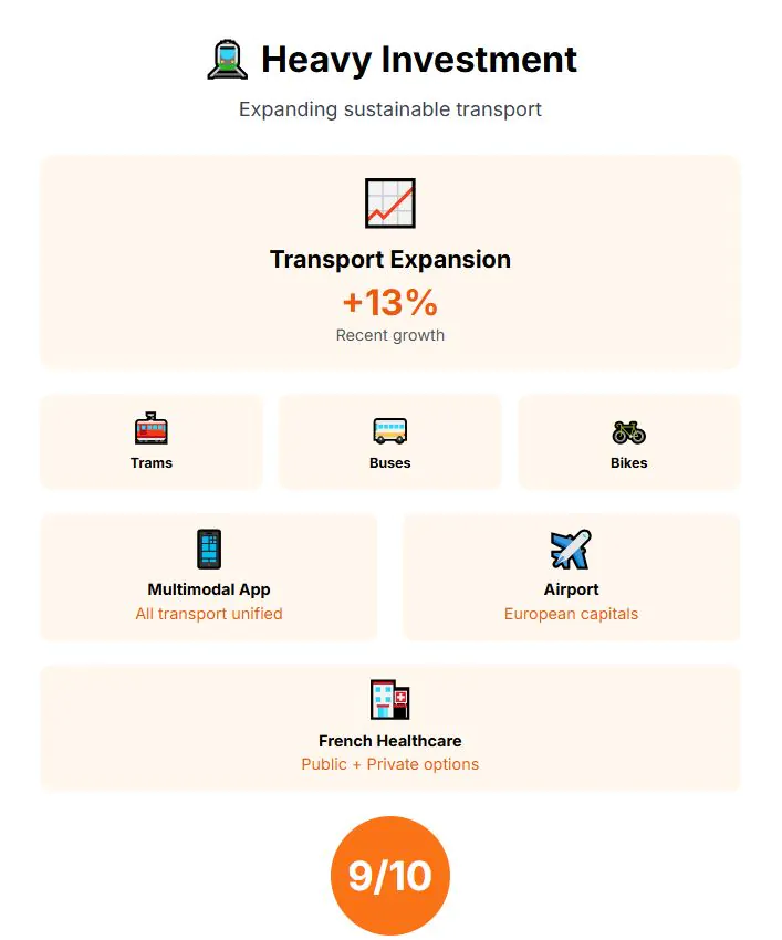 Infrastructure is where Bordeaux invests heavily. In recent years, public transport expanded by 13 percent, and the city now operates a multimodal app tying together trams, buses, and bikes to meet sustainability goals. The local airport has direct flights to other European capitals, and healthcare here reaches full French standards, combining high-quality public hospitals with optional private clinics. Infrastructure score: 9 out of 10.