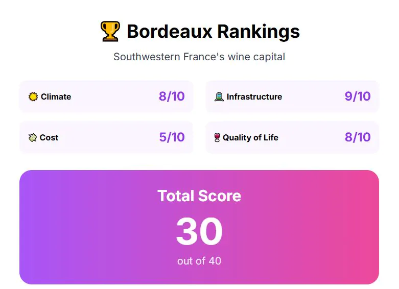 Quality of life also ranks high. The city has abundant green spaces, a strong safety record, and cultural amenities connected to its wine region identity. Think of it like living in California’s wine country, but with French healthcare included at standard rates. Quality of life score: 8 out of 10.