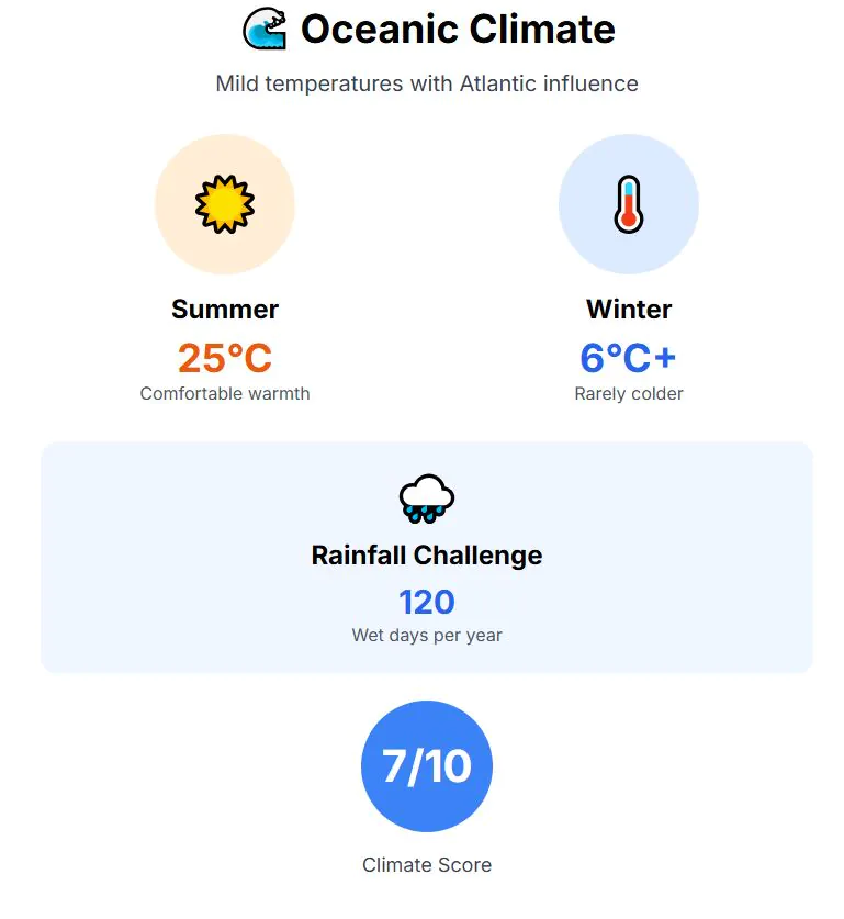 It is located on the Atlantic coast, where summers average 25°C and winters are rainy, but without the freezing conditions of northern Europe. This steady pattern avoids extremes while still giving seasonal variety. For climate (and for people who enjoy cool weather and refreshing rain), Porto scores 9 out of 10.