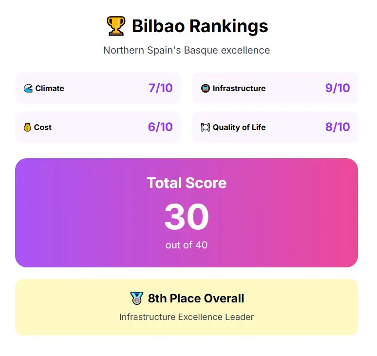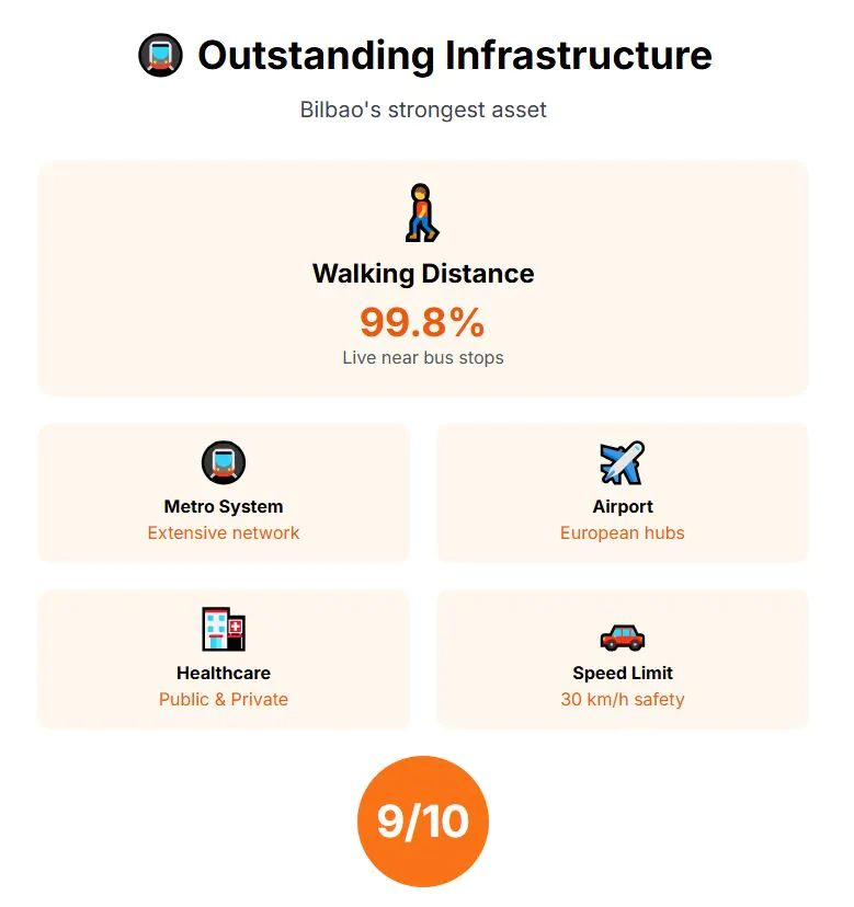 Infrastructure is Bilbao’s strongest point. Its metro and bus systems are extensive, the airport connects directly to top European hubs, and healthcare ranks well with both public facilities and private clinics. The city also enforces a 30 km/h speed limit that reduces accidents and pollution. Infrastructure score: 9 out of 10.