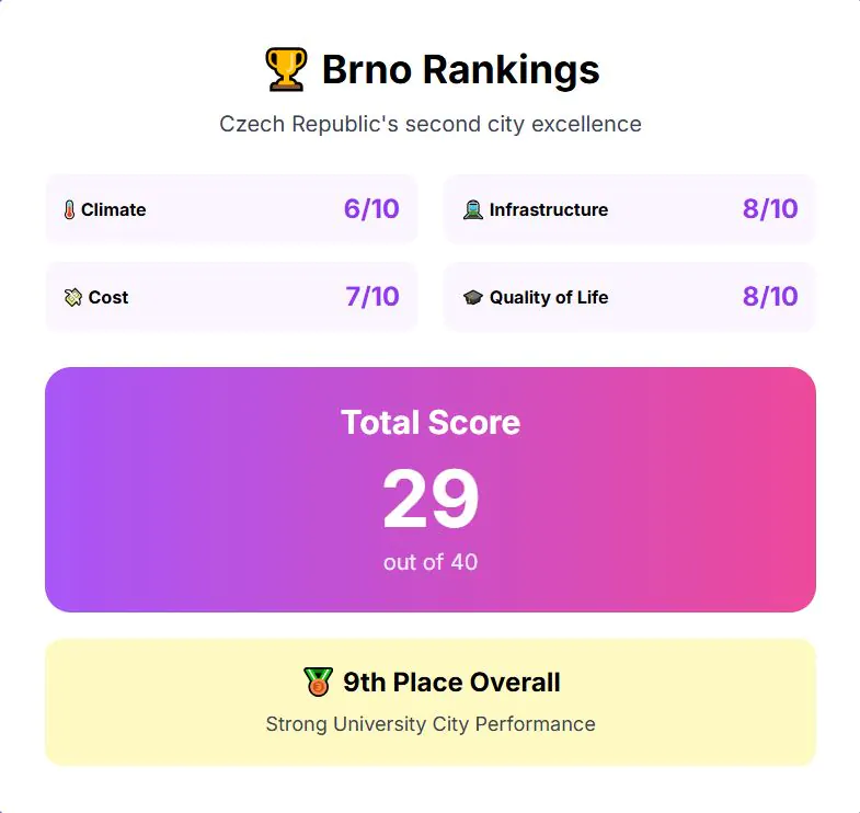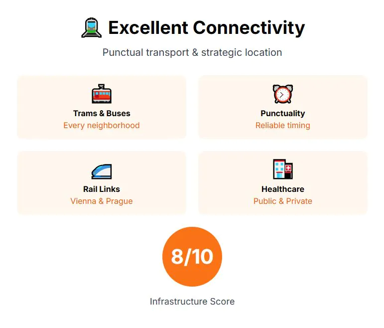 Infrastructure is one of the city’s strengths. The tram and bus network reaches virtually every neighborhood and is known for its punctuality. Brno’s airport offers short-distance connections, but easy rail links to Vienna and Prague expand travel options significantly. Healthcare access is consistent, with both public and private facilities available, although regional inequalities remain. For infrastructure, Brno earns 8 out of 10.