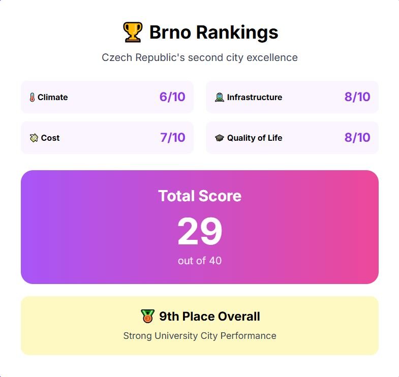 Altogether, Brno marks a total score of 29. From here, we head to a rainy northern city that developed considerably during the last few decades.