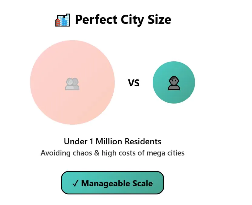 - Each city must have fewer than one million residents, so as to avoid the high costs and the chaos of very large cities.