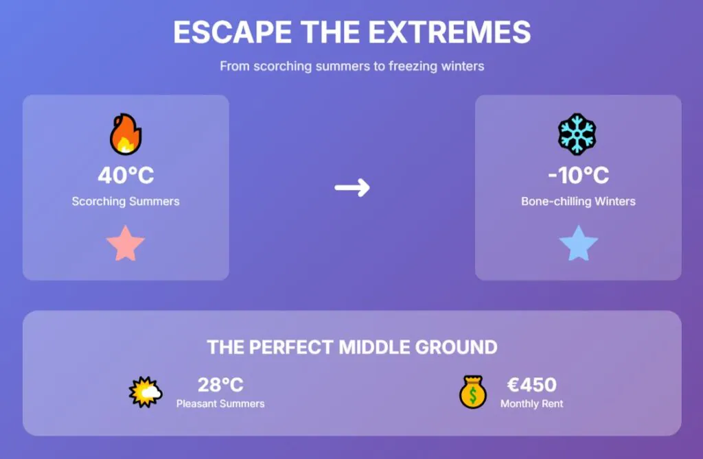 Imagine escaping scorching 40°C summers and bone-chilling -10°C winters, while renting a central apartment for under €450, and enjoying good healthcare – all for a fraction of the costs.