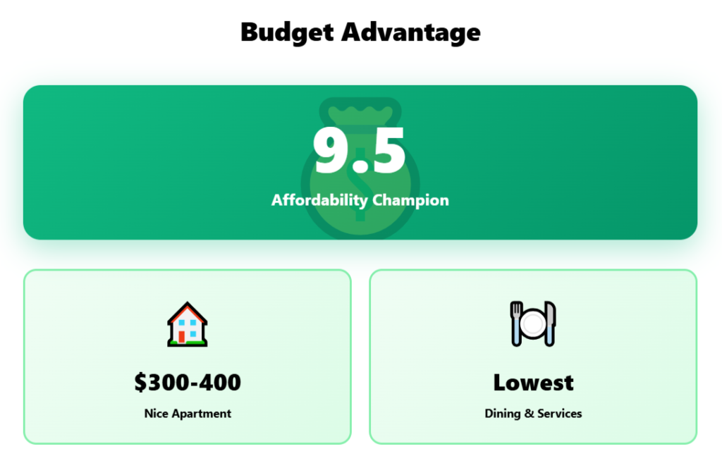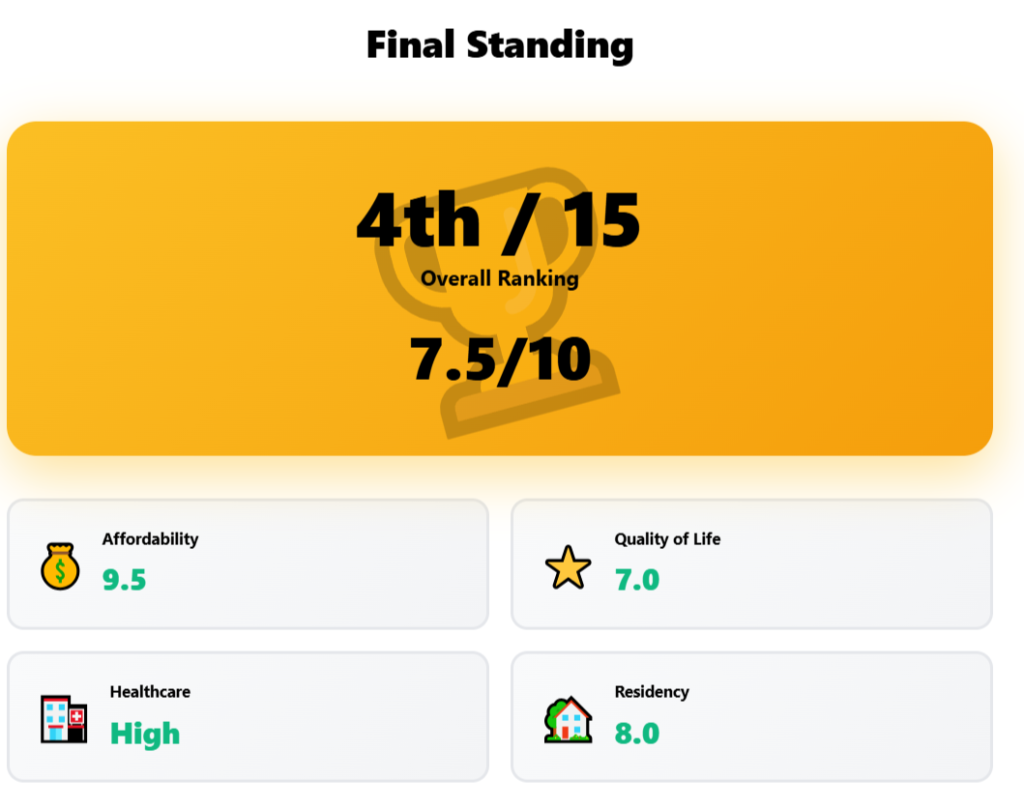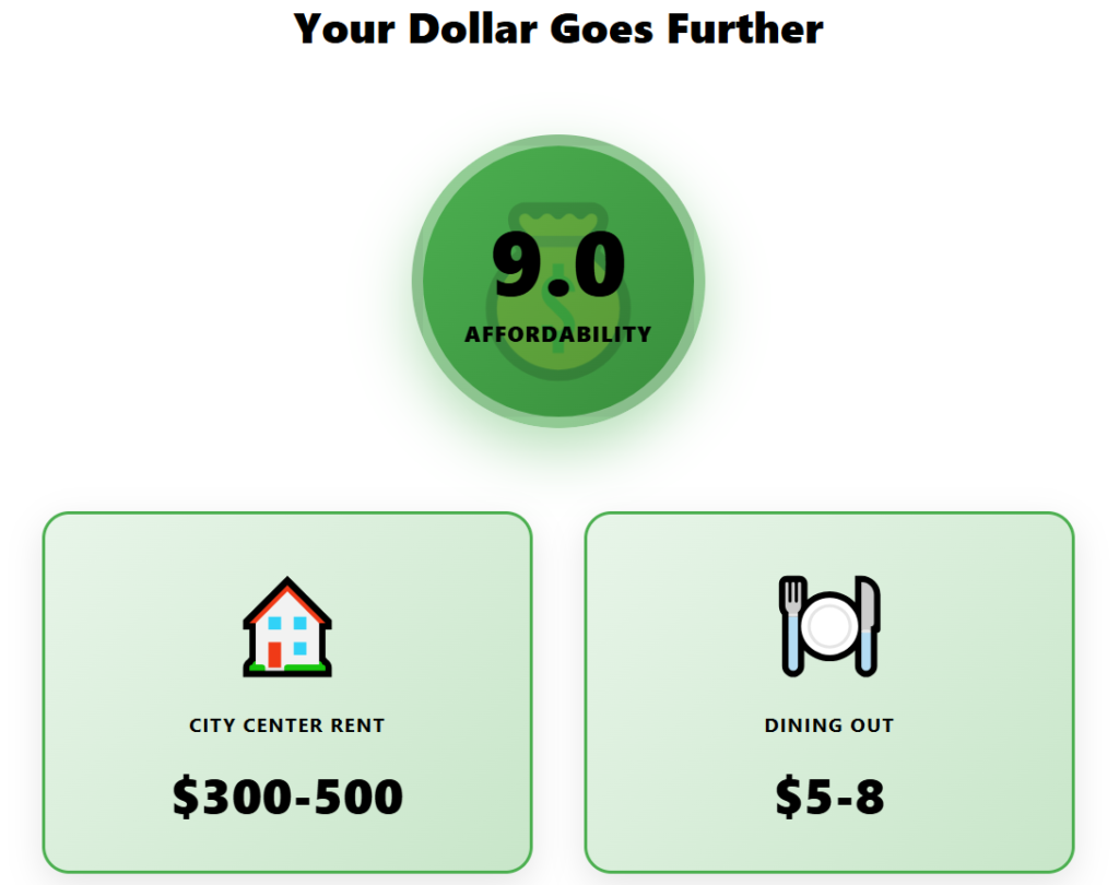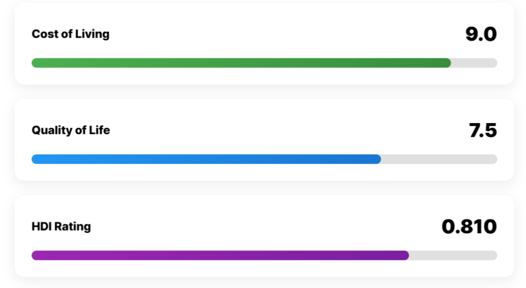 Food is another win. Locals can eat well without paying premium prices. We score Cost of Living at 9.0.
