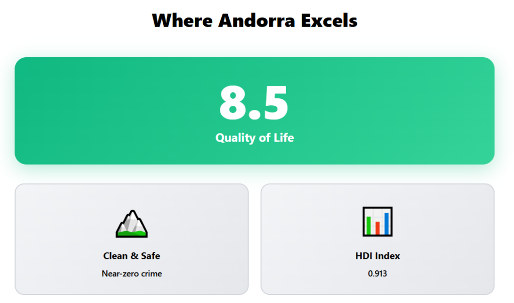 The Cost of Living score is just a 5.0. On the other hand, Quality of life is where Andorra shines.