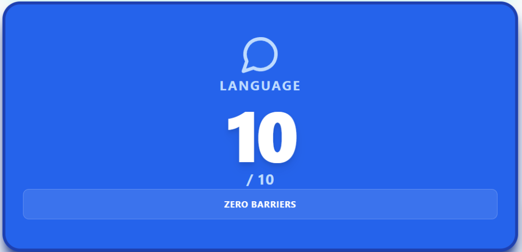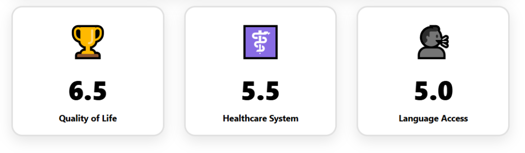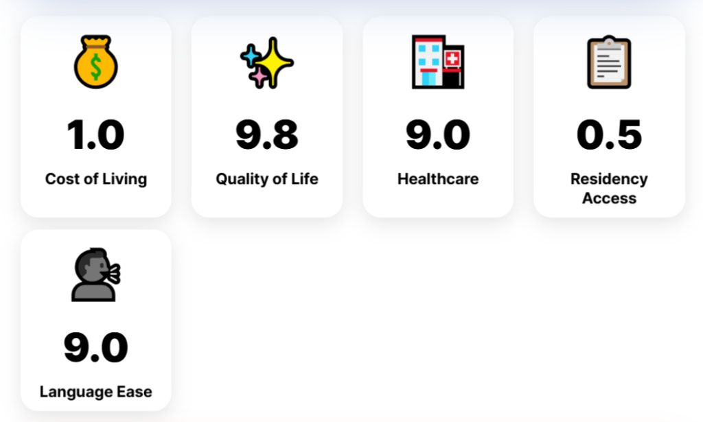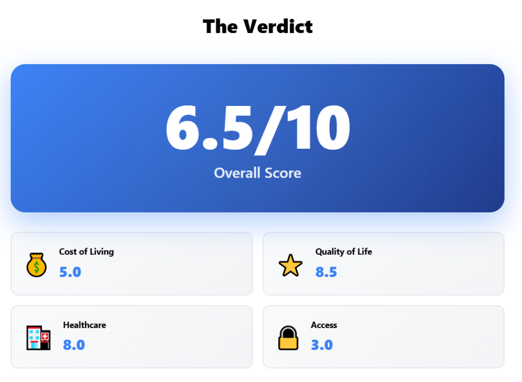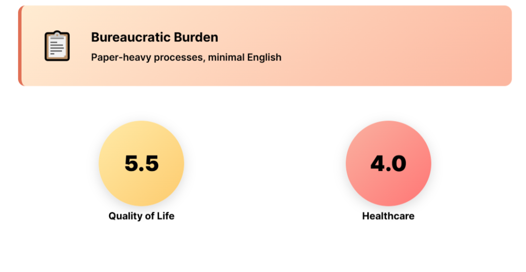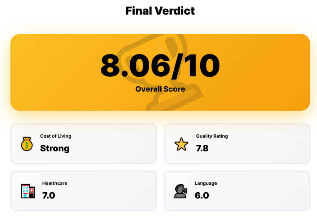 The process stays clear, so the Residency Ease factor gets an 8.0 out of 10. Language barriers score 6.0, since younger people speak good English and help tends to show up when you need it.