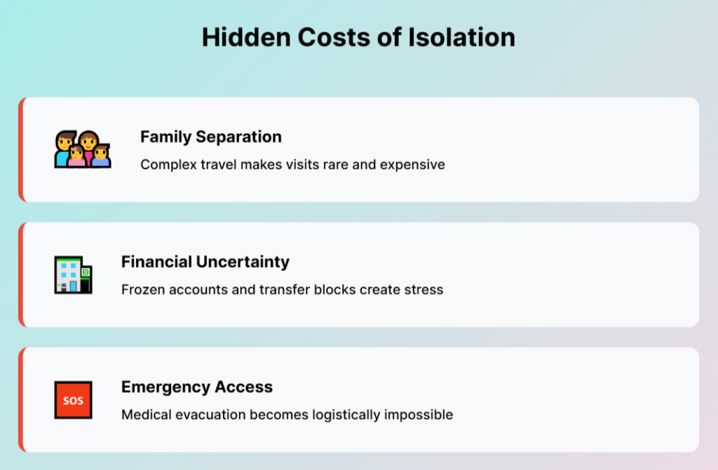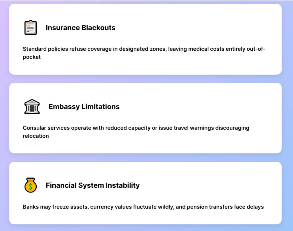Freedom of movement is severely restricted. Healthcare presents a massive financial hole and standard international insurance policies exclude coverage for war zones.