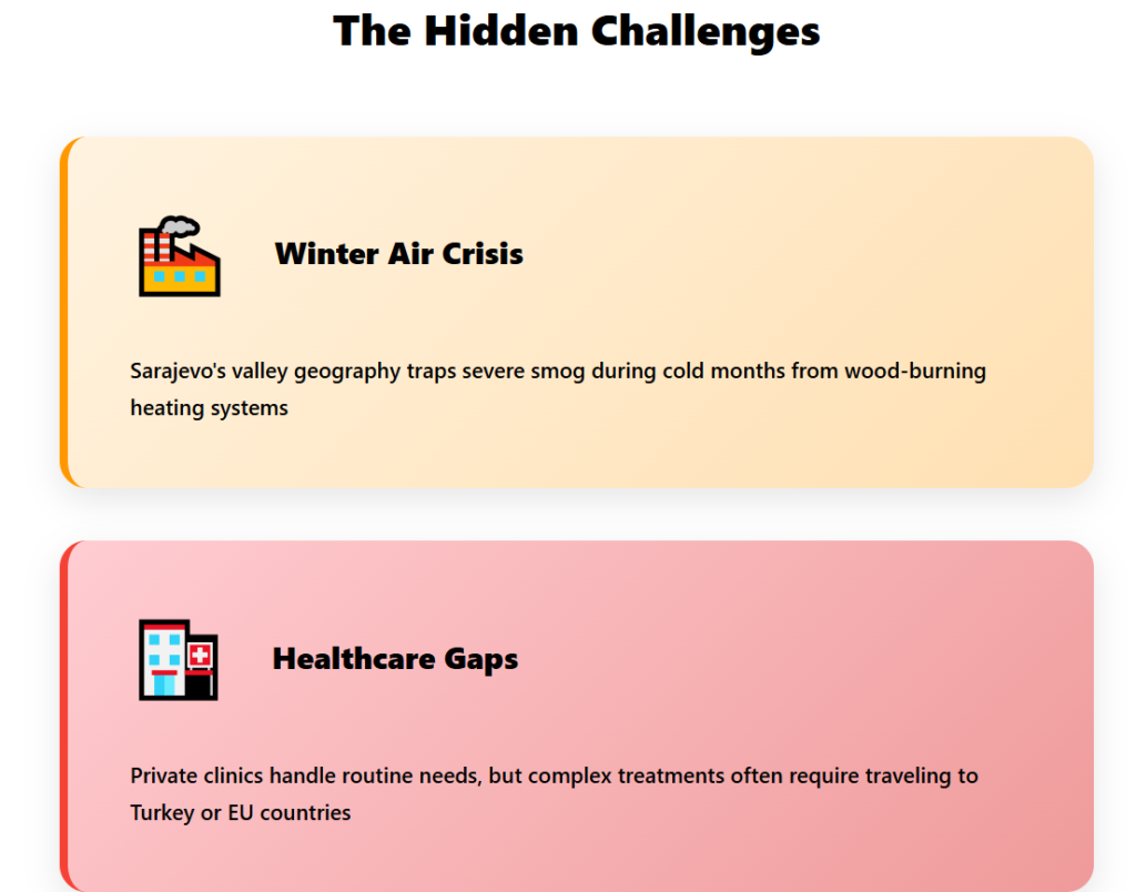 That single seasonal problem drags the Quality of Life score to 6.5, while Healthcare gets a 5.5 due to some gaps for complex treatments. English helps in tourist areas and with younger people, but for official tasks you hit a wall without Bosnian, Croatian, or Serbian.