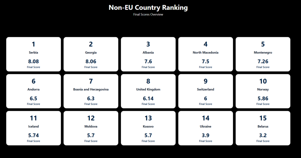 North Macedonia ends with an average score of 7.50 out of 10, and the 4th place among the 15 Non-EU countries in our ranking.