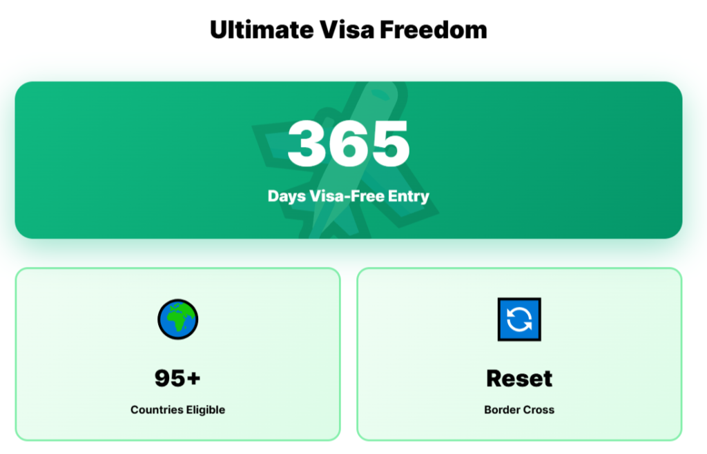 Residency is where Georgia separates itself from almost everyone else. Citizens of 95+ countries, including the US and UK, get one year visa-free.