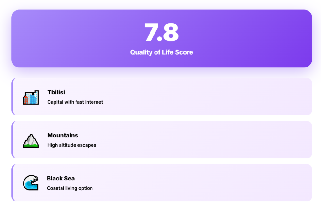 Younger Georgians speak English, while older people speak Russian. Georgia’s final average score is 8.06 out of 10, and that’s what happens when visas stop being the bottleneck.