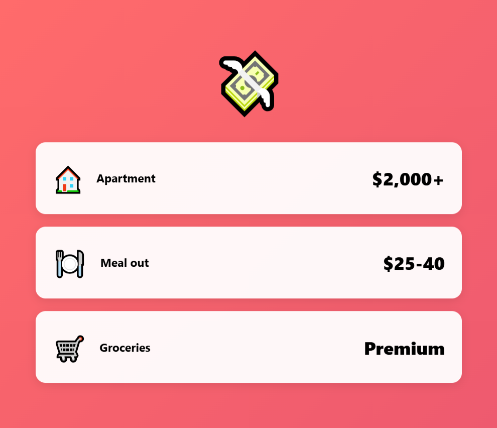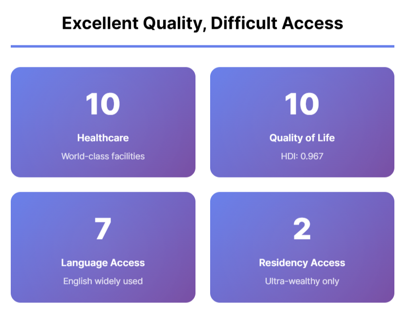 English proficiency is estimated at about 98%, so daily life would feel easy on this aspect. So you get world-class quality and development, for a very high price – but there are some additional barriers…
