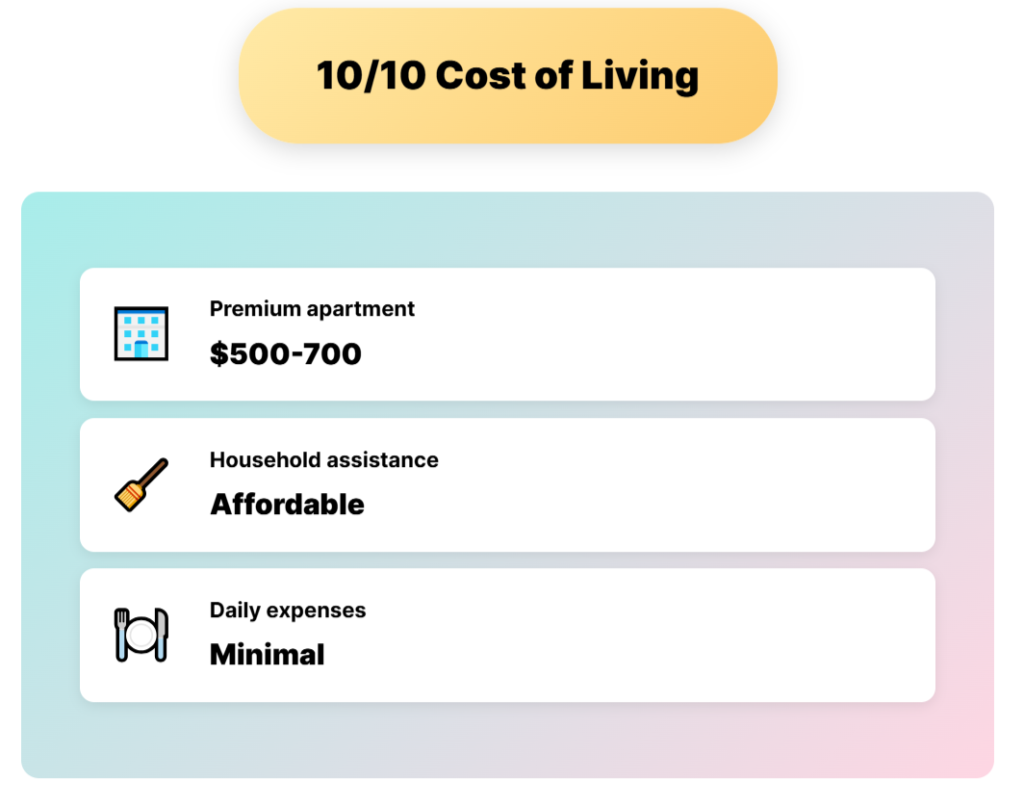 Luxury rent runs $600 to $1,000, which leaves you room for private care, travel, and savings. Daily transport also stays cheap, with taxi rides at $2 to $3, so you don’t need a car to move around.