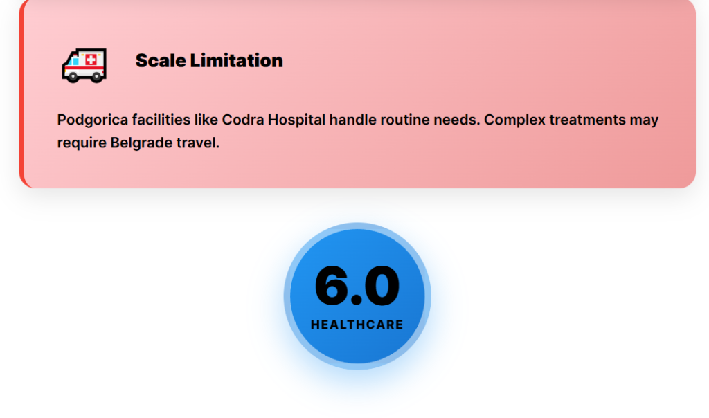 But Montenegro is small, so ultra-specialized care can mean a trip to Belgrade. That keeps Private Healthcare score at 6.0.